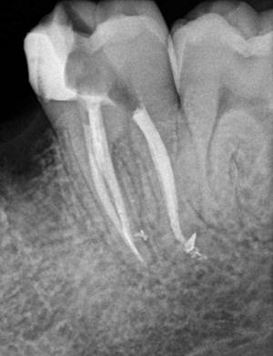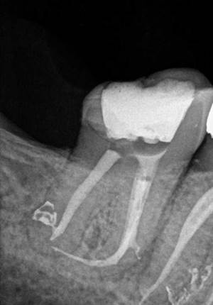 Radiografía de endodoncia finalizada de molar mandibular con mucha curvatura en la raíz mesial y donde se observan conductos laterales en ambas raíces que hemos conseguido sellar.