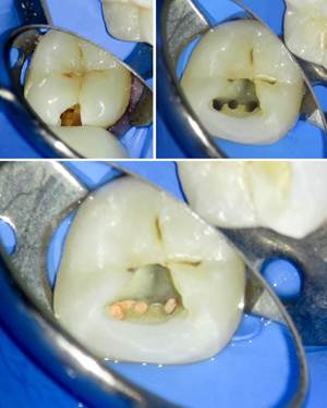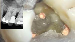 Imagen clínica bajo microscopio durante el acceso a un molar mandibular con una anatomía poco frecuente que presenta 3 conductos en la raíz mesial.