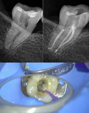 Radiografía de retratamiento de endodoncia donde en la inicial se observa una lima separada en un conducto. En la final se ve cómo hemos sobrepasado la lima y hemos conseguido obturar el sistema de con ayuda de la magnificación.